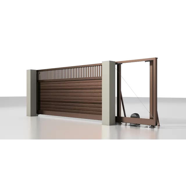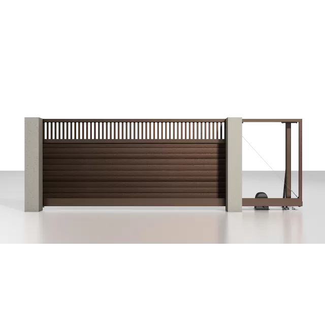 Сдвижные ворота серии Prestige Рама: 96 мм. Комбинированное заполнение: сэндвич-панель L-гофр и разреженный профиль 37 мм. цвета «Шоколад» (RAL 8017). Автоматика ALUTECH Roteo
